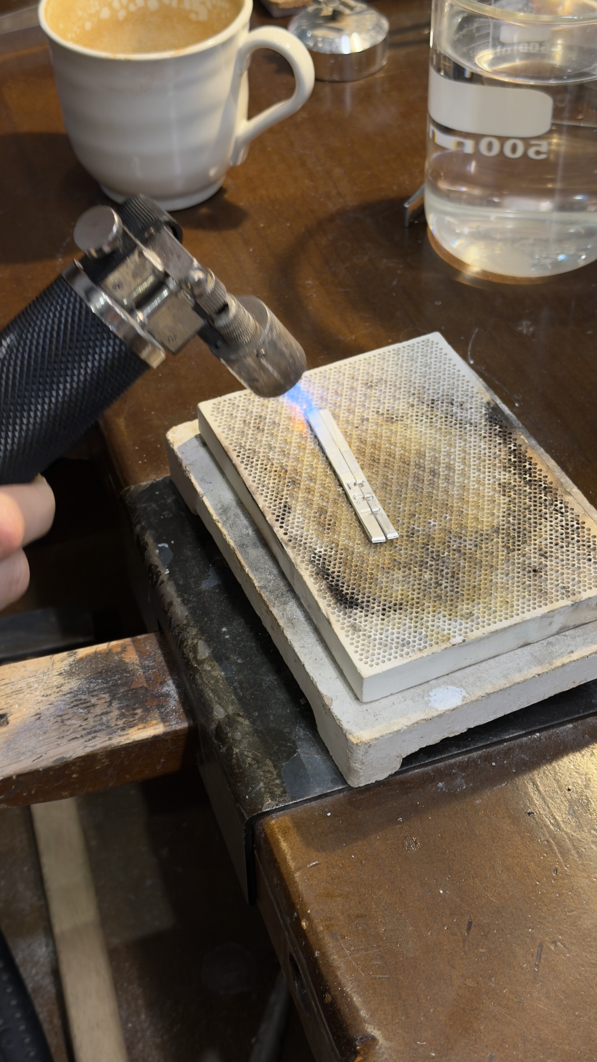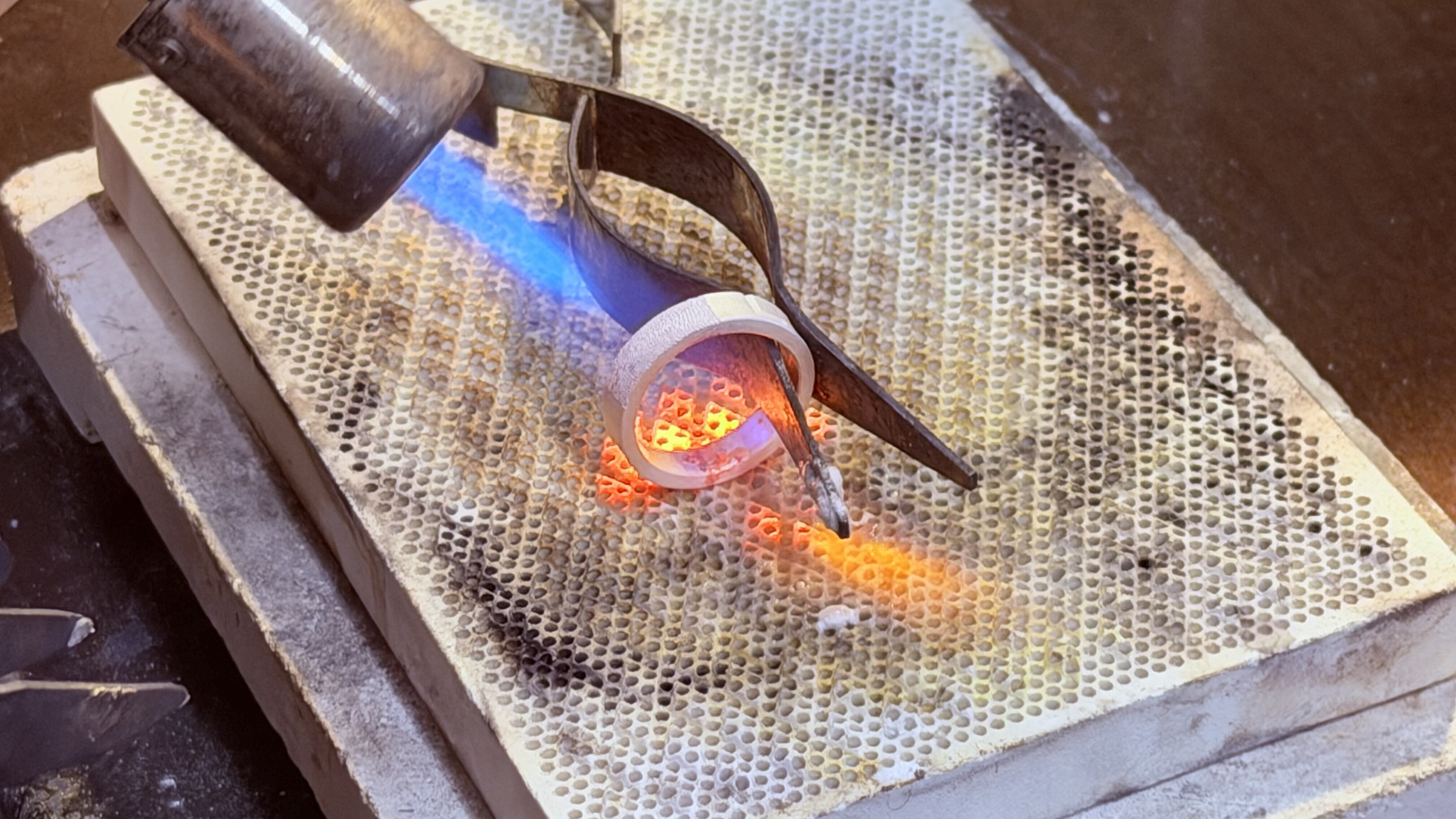 用镊子夹出小银片放在接缝处用喷火枪加热,融焊,上下均匀加热几秒钟便融合在一起了,它的熔点比纯银低。店员指导你上下均匀加热,这是为了防止热胀冷缩导致接口不平。这一步是决定戒指会不会断裂的关键。