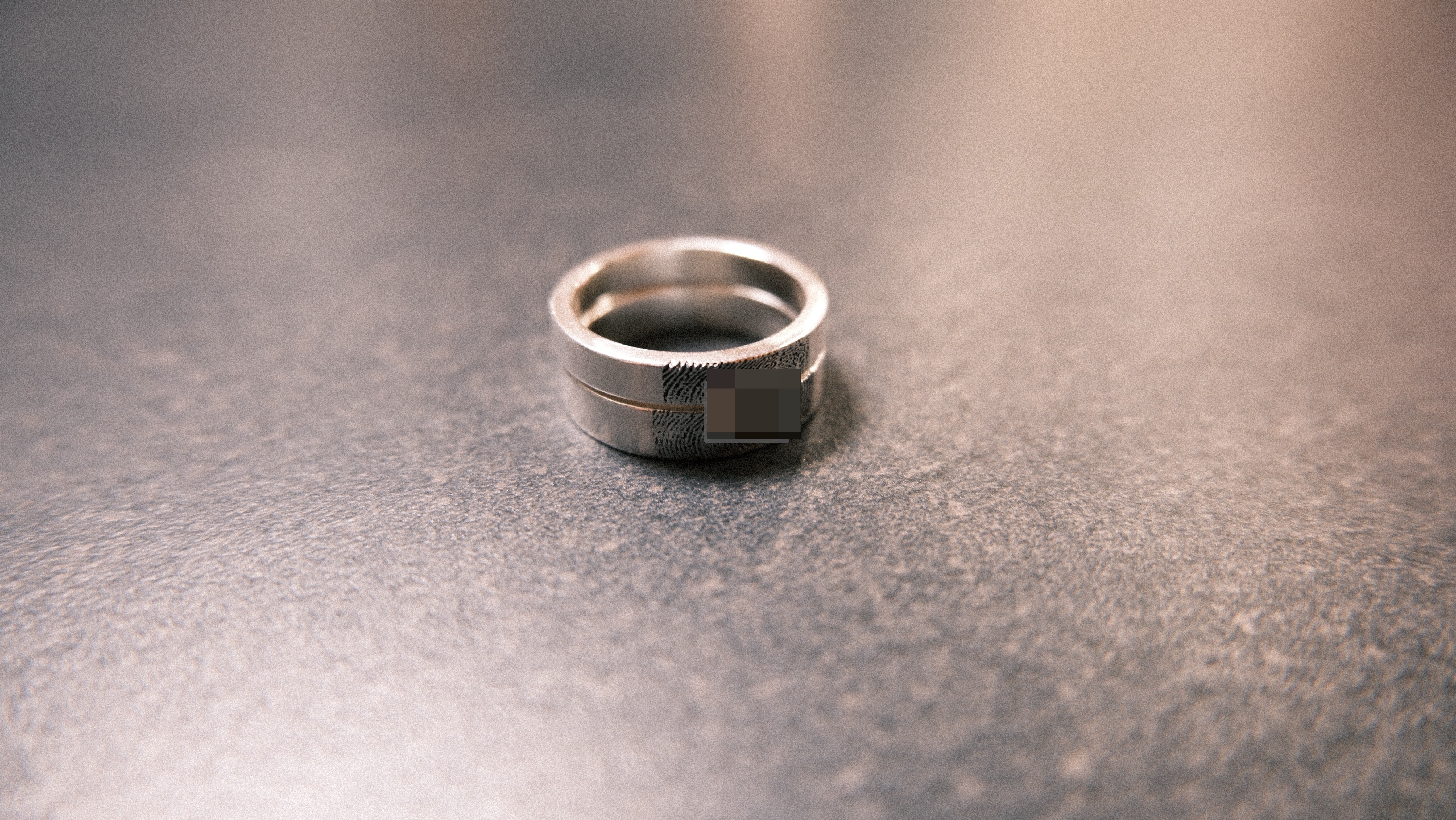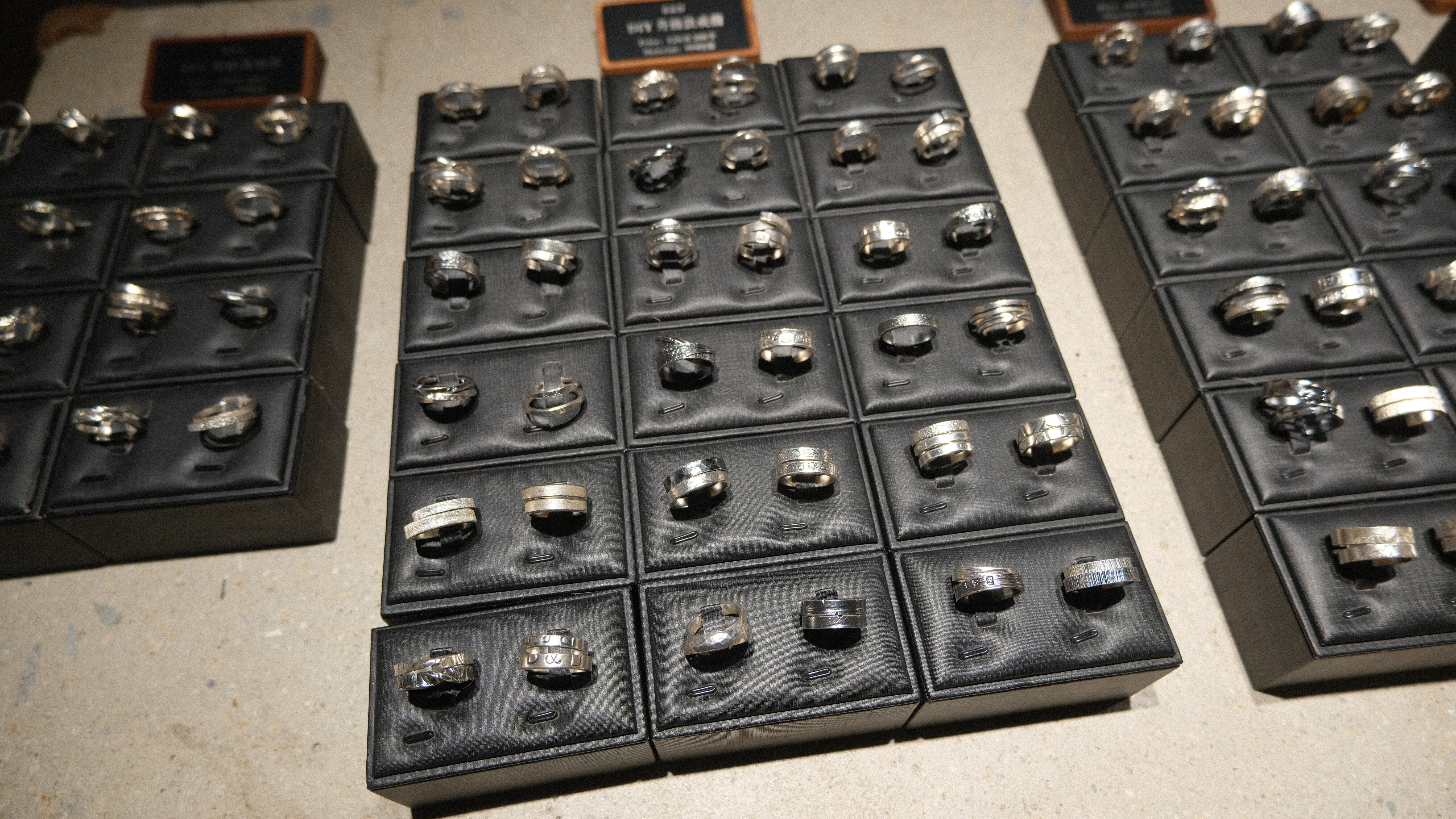 门口陈列着不同款式的戒指。看了很久,最终没有完全照着某一款来,而是选了两种样式里各自最喜欢的部分:**深刻的大写字母,加上指纹。**山峰系列也很吸引人,但要加钱,元素也多了一点,反而显得冗杂。我们想要的,是简单、直接、不会被时间稀释的东西。