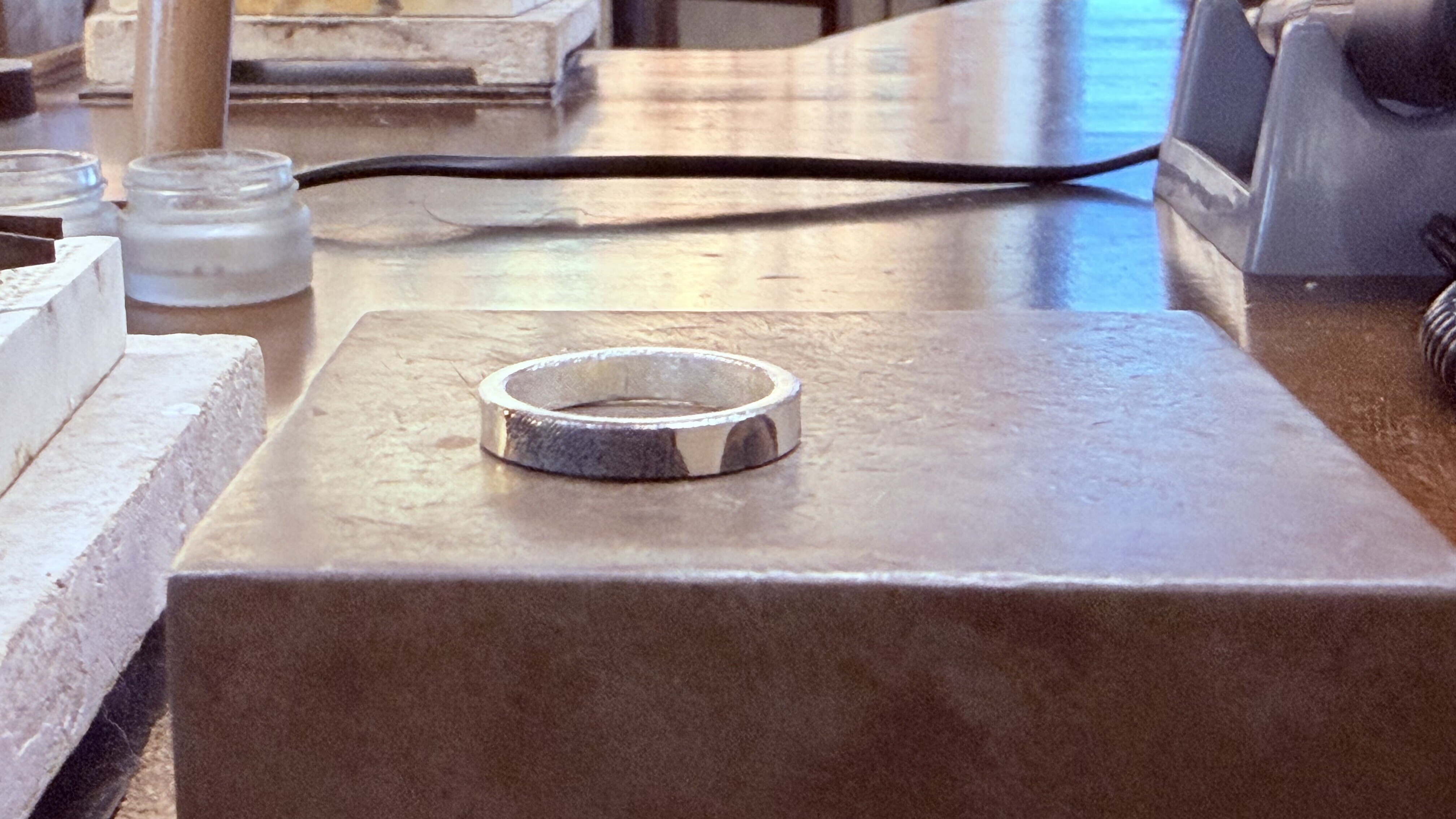 先穿上围裙,坐在工作台前,领取一小根银条。第一步是敲打银条,用橡胶锤轻轻敲直,让它贴合桌面。