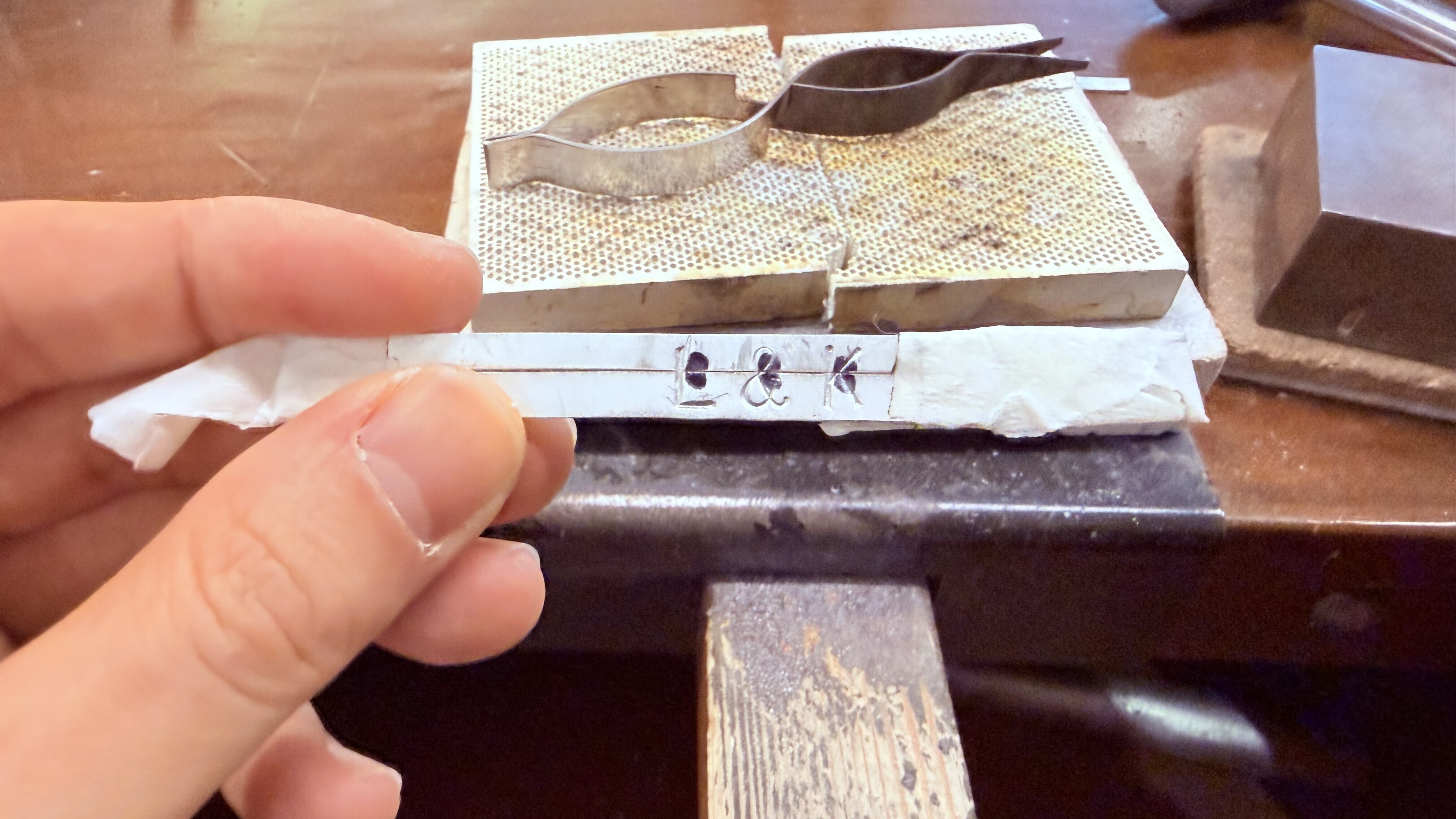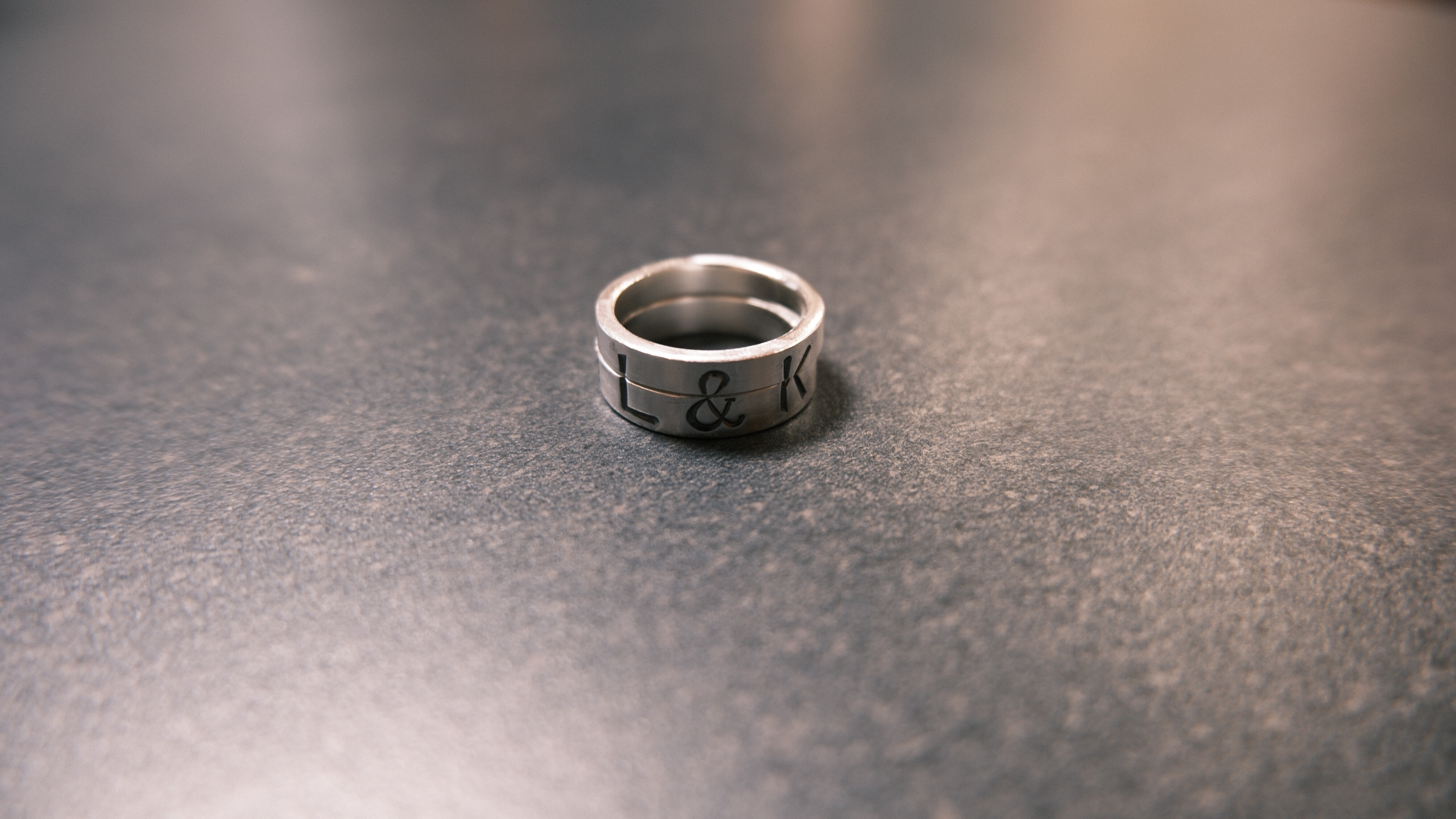 因为是两枚戒指对半的字母,又加上戒宽不同,位置必须提前想好。确定了,就不能犹豫,一锤定音,duang!