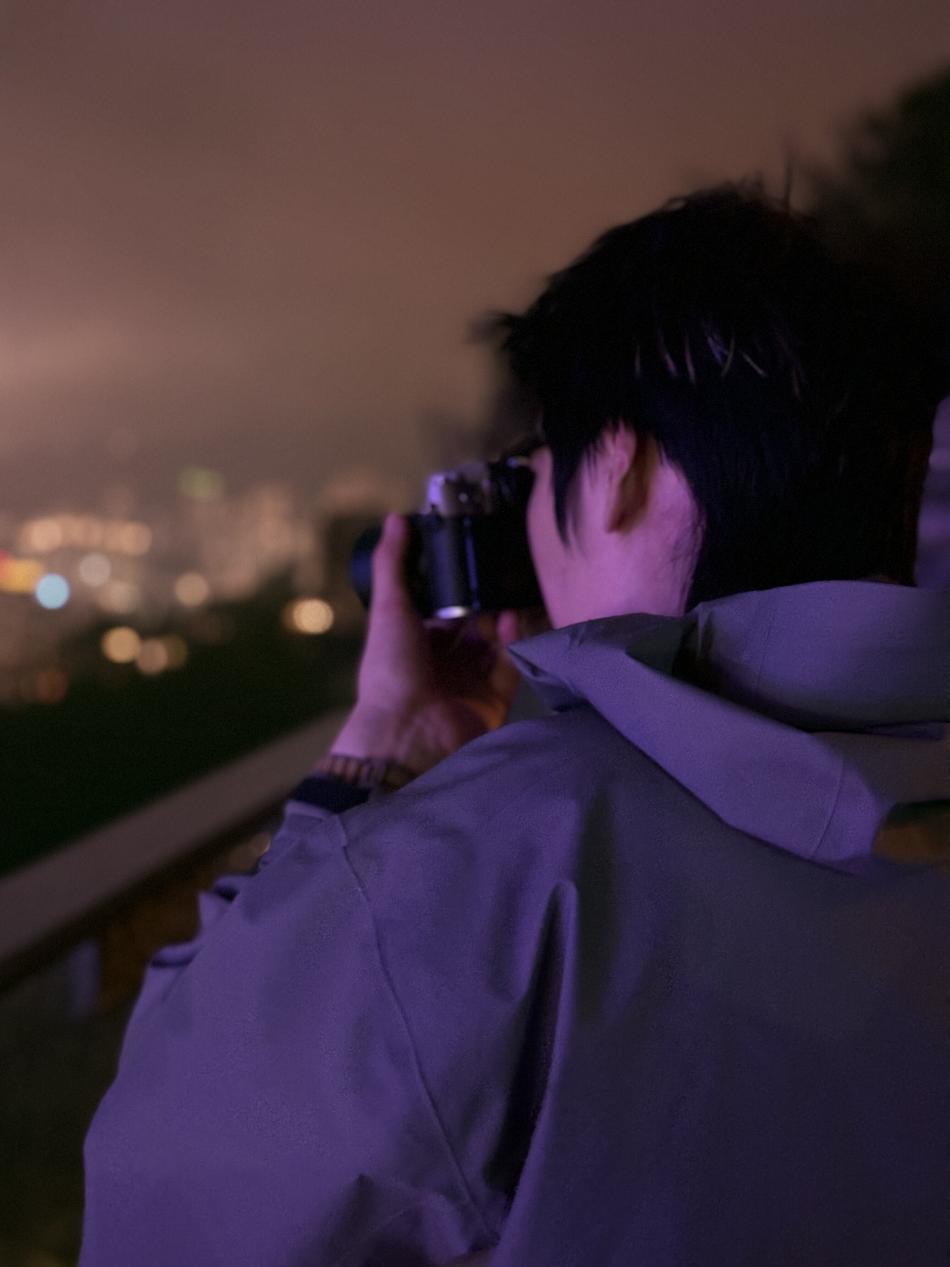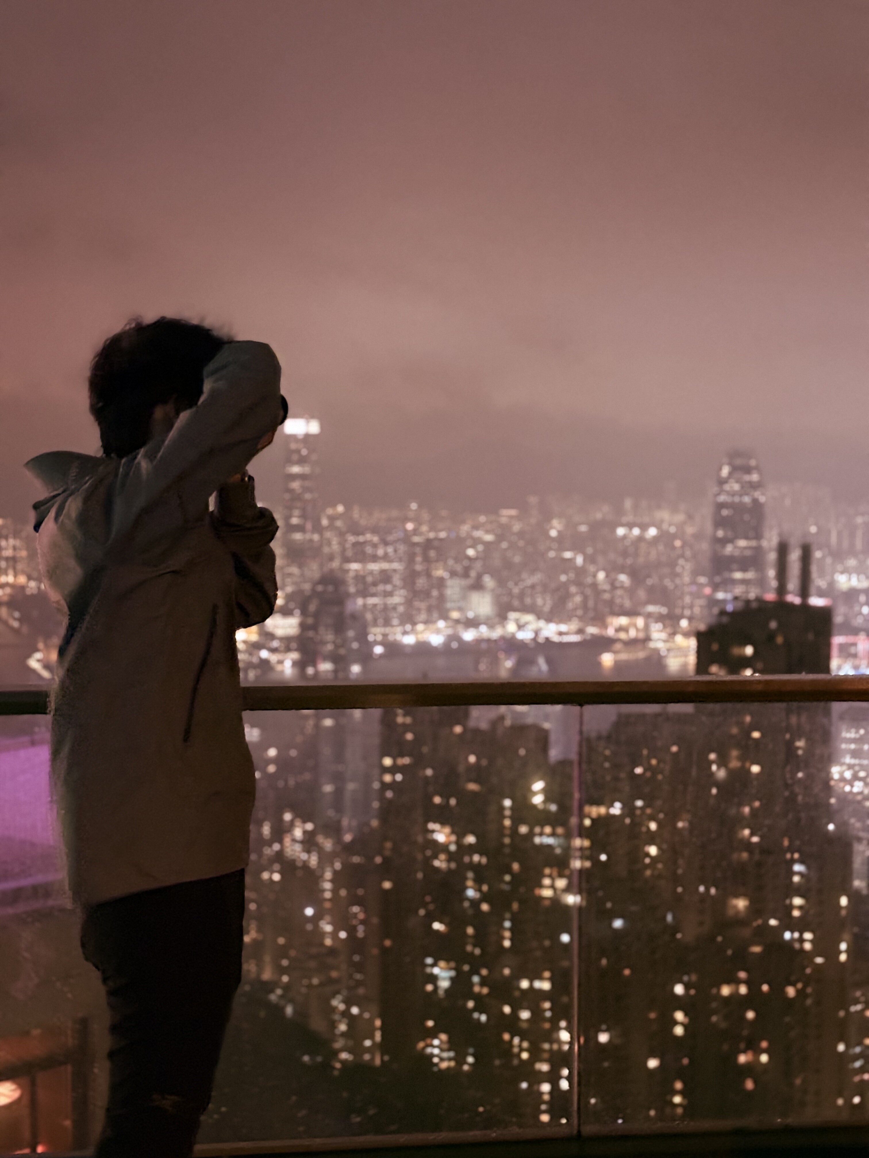 等我们走到外面已经有很多人了,可以想象早一点人肯定很多。山上雾气很大,能见度不高,风也很大,头发迎风飞舞,但是十一月的香港一点都不冷,短裤也 hold 住。套机镜头没有大光圈,而且刚上手还不会拍,出片效果还是比不上 iPhone 的算法。